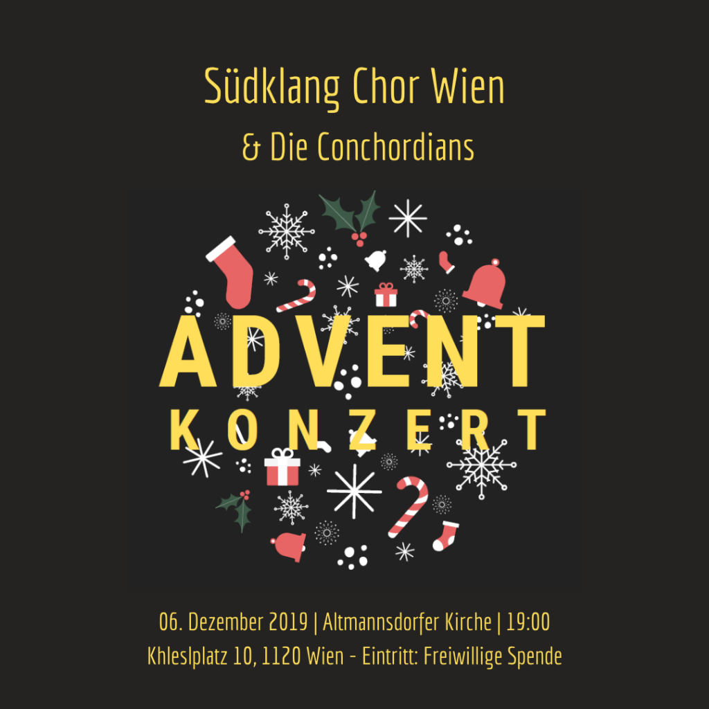Am 06. Dezember lädt der Südklang Chor zum Adventkonzert in der Altmannsdorfer Kirche, Khleslplatz 10, 1120 Wien! Wir freuen uns, euch gemeinsam mit unseren Gästen, den Conchordians in Weihnachtsstimmung singen zu dürfen! Das Konzert beginnt um 19:00, anschließend laden wir zum gemütlichen Ausklang! Der Eintritt ist frei, wir freuen uns über eine freiwillige Spende!