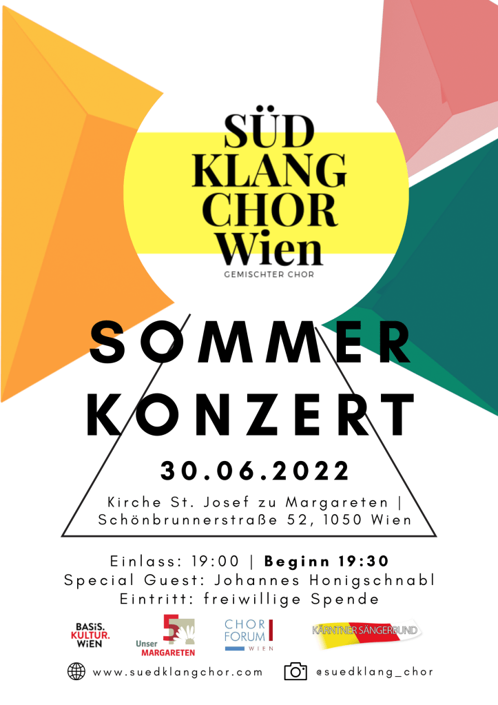 Das 2. Südklang Sommerkonzert steht an! Am 30.06.2022 laden wir ab 19:00 in die Pfarrkirche St. Josef zu Margareten in 1050 Wien um euch endlich durch unser lang vorbereitetes Sommerprogramm singen zu dürfen! Vorbereitet haben wir in alter Südklang-Tradition einen schwungvollen Mix aus kärntnerischer und internationaler Literatur. Zusätzlich konnten wir wieder den großartigen Johannes Honigschnabel als Gast gewinnen, er wird uns einige Stücke auf seiner Harmonika beisteuern.